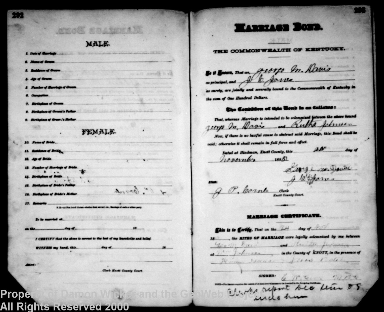Bonds start on Sept 7, 1889 to June 6, 1898 and has 153 pages. It just has marriage bonds only listing groom, bride, bondsman, date of marriage, ministers who performed the marriage and witnesses. Sometimes a permission slip is available. These contain the actual handwriting of an ancestor and some of them are very interesting and have interesting signatures. Many are now missing from the clerk' office as they were just placed loose in the books. They are included in the images below. So, if you find a relative below, be sure to look at the lines below for a permission slip! I believe there are 27 permission slips in Book 1A.
