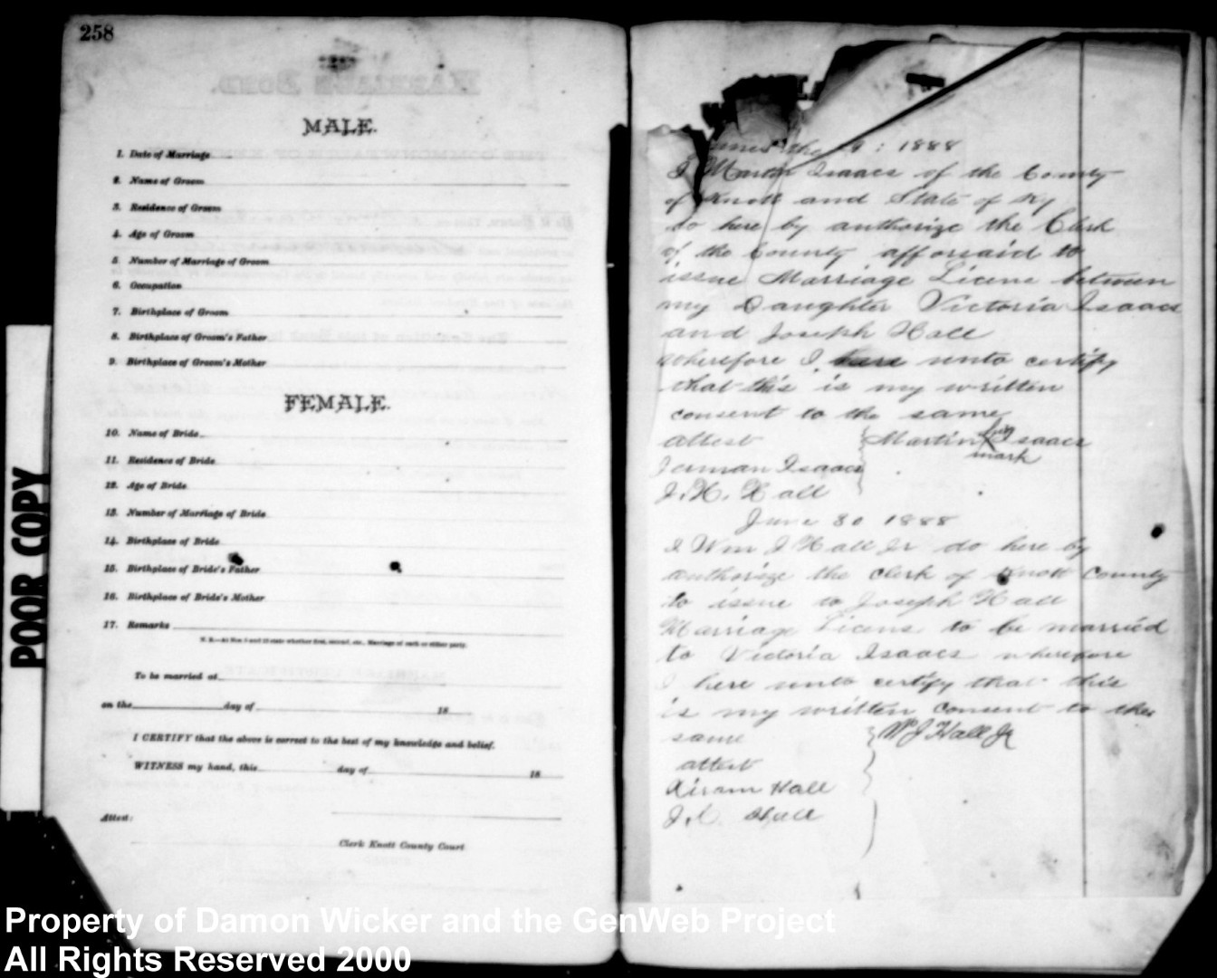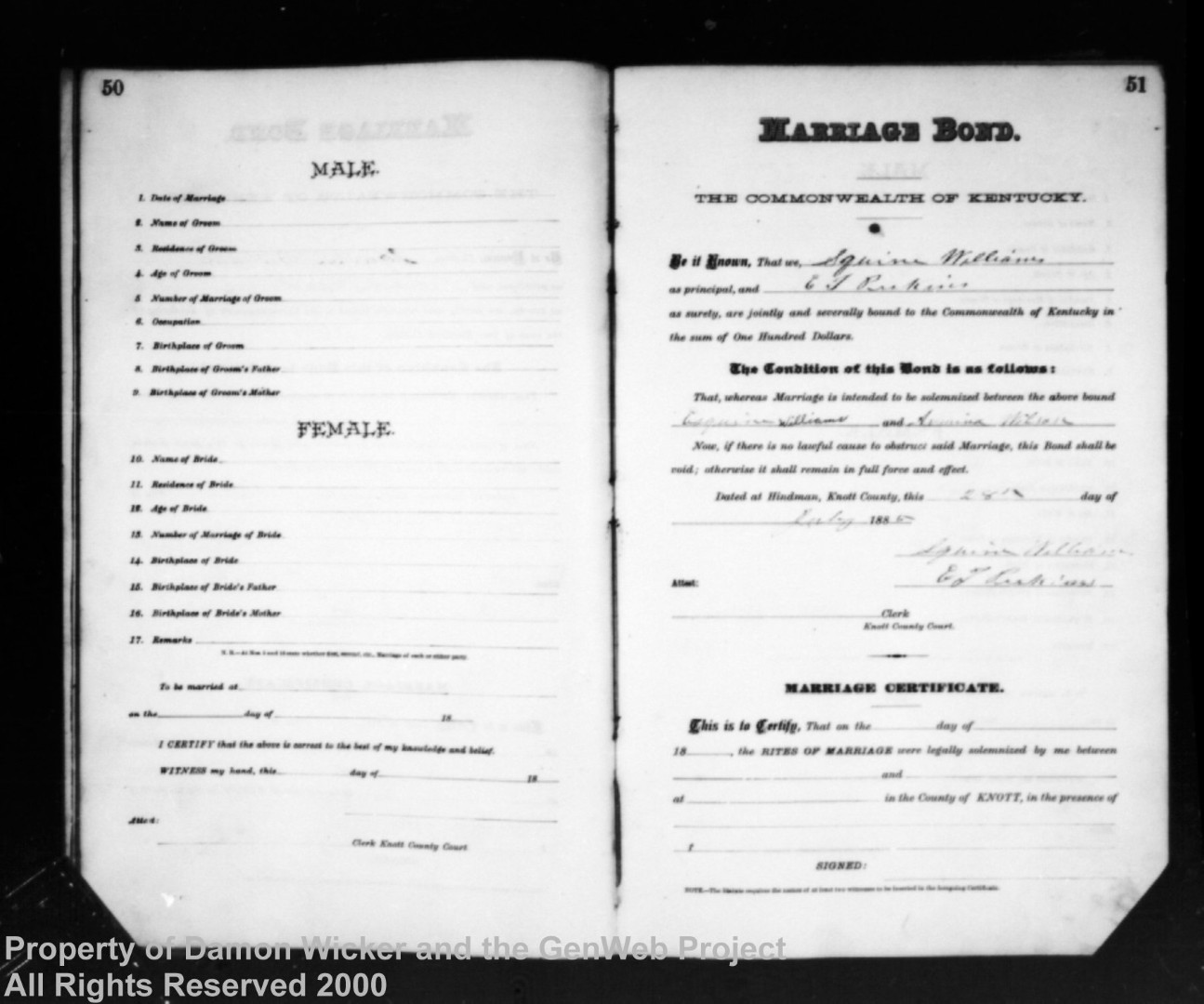 | Williams | JohnR | Hagans | Vina (colored) | 1890-12-25 | ***Permission Slip *** | |||||