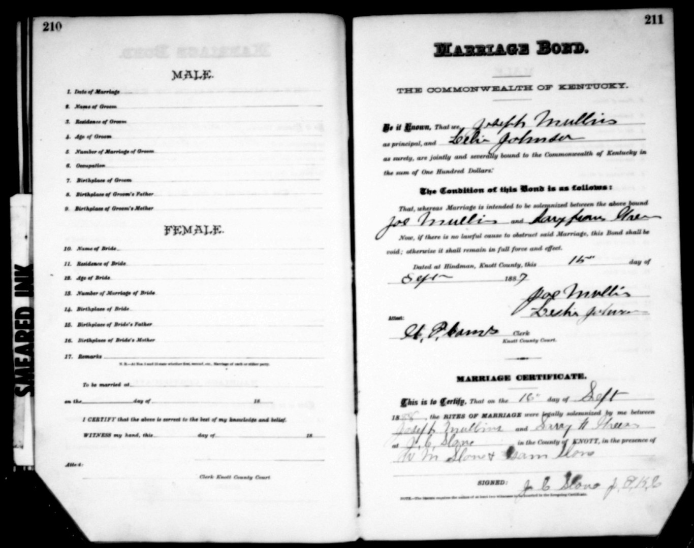 | Casebolt | William | Mullins | Sarah Ellen | 1890-09-16 | ***Permission Slip for Sarah*** | |||||