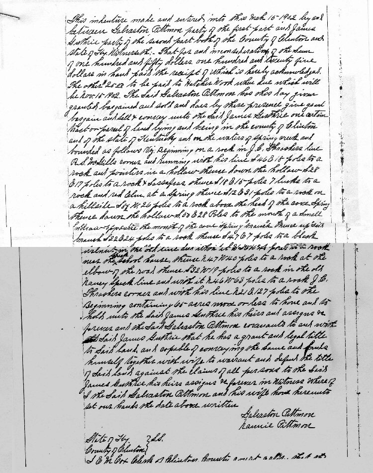 Galveston Pittmon has this day given granted bargained and sold and does by these presence give grant bargain and sell & convey into the Said James Guthrie one certain tract on parcel of land lying and being in the county of Clinton and of the state of Kentucky and on the waters of spring creek and