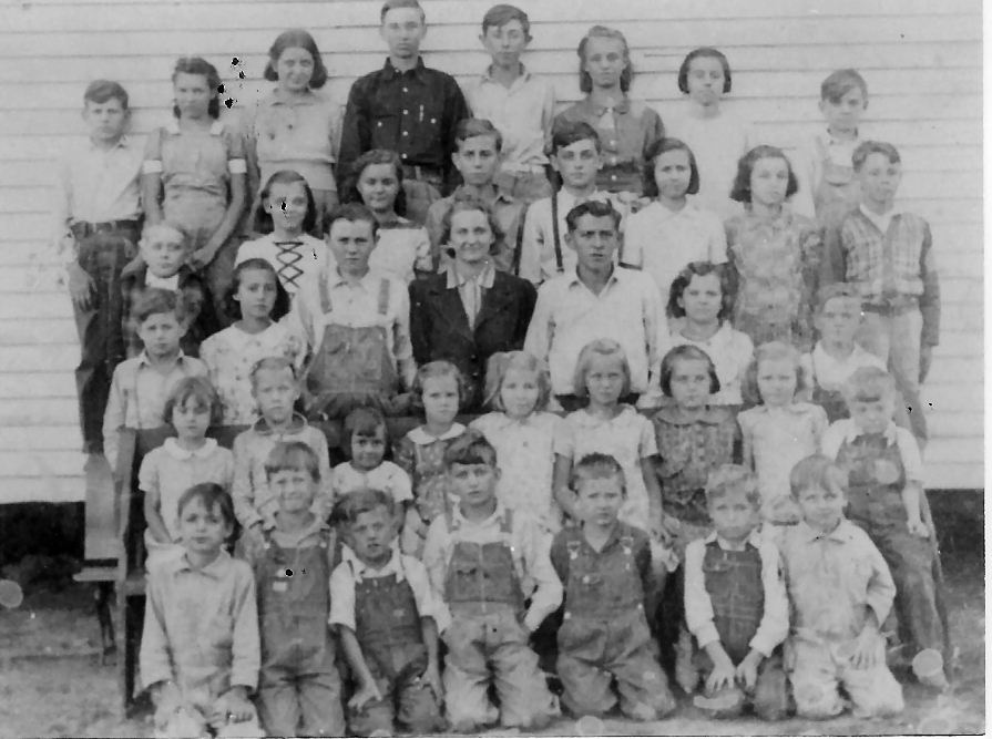 Cave Spring School, Clinton County, KY. I am unsure of the year, but it may be the late 30's or early 40's. My uncle, James Edgar Elmore is the 3rd one in the 3rd row, in overalls. |