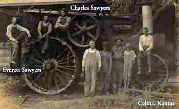 Far left: Everett Sawyers, son of James Walker Sawyers and Mary Olive Griffin Sawyers. Third from left: Charles Elmer Sawyers, son of Frederick Hartwell Sawyers and Nancy Leann Guthrie Sawyers. This photo was taken in Celina, Kansas about 1920. |