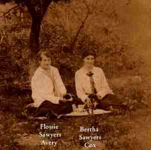 Flossie Avery Sawyers, eife of Cleo Sawyers, born 1900, died 1919. Bertha Sawyers Cox, wife of Reed Cox. This photo was taken about 1918-1919. |