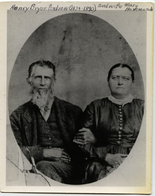 Henry Byron Andrews (1834-1890), the first son of John C. Andrews and Elizabeth Back Cooper. He is pictured here with his second wife, Mary Hammond. (His first wife was Louisa Jane Hopkins, daughter of Thomas Hopkins/Matilda Ryan.) |