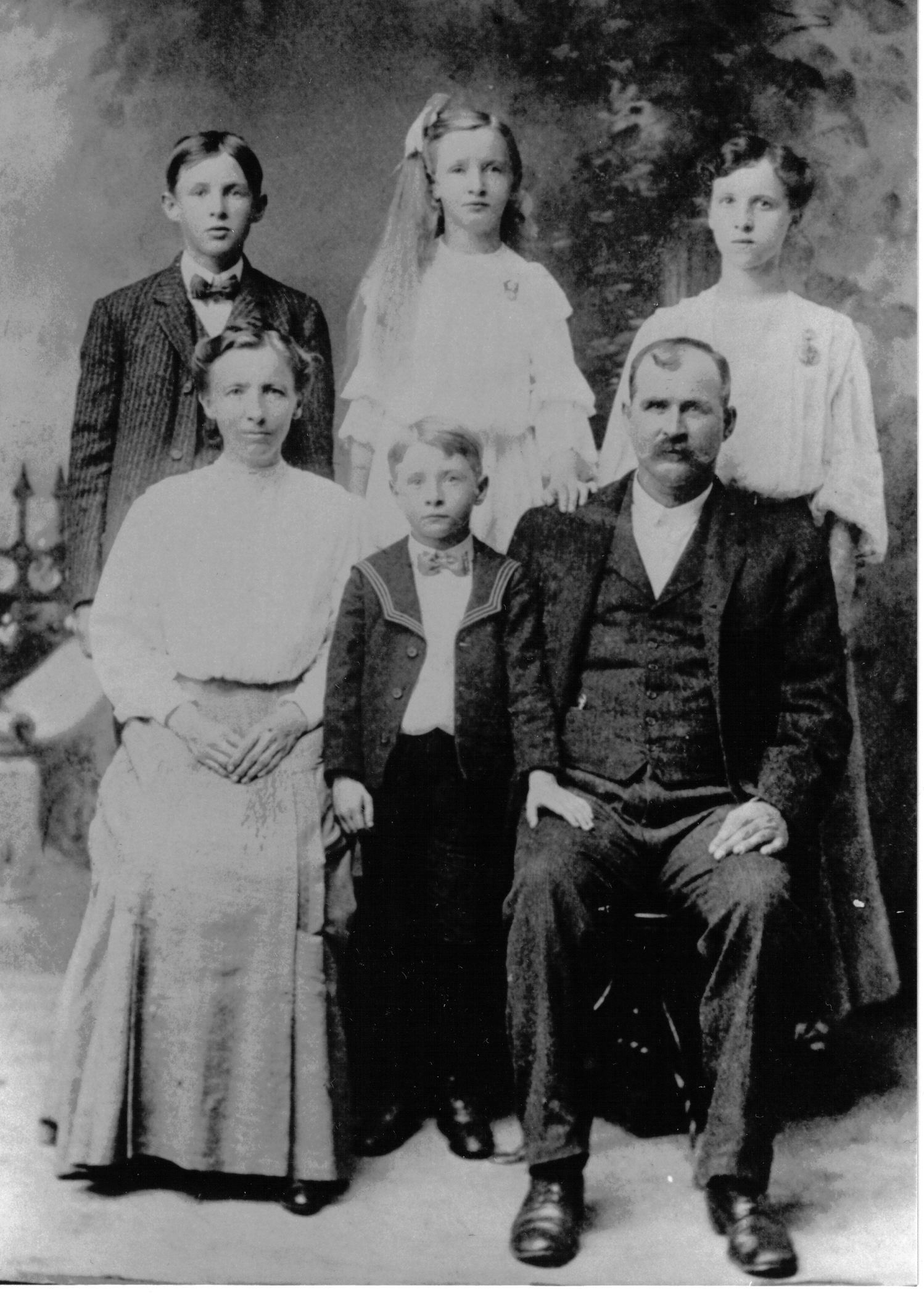 Photo of William Floyd Wray family. He was the 4th child and son of William Charles Wray and Dora Ann Wright. The photo was taken around 1905-1907, most likely in Hoopeston, Illinois. Those in the photo are (clockwise from top left): |