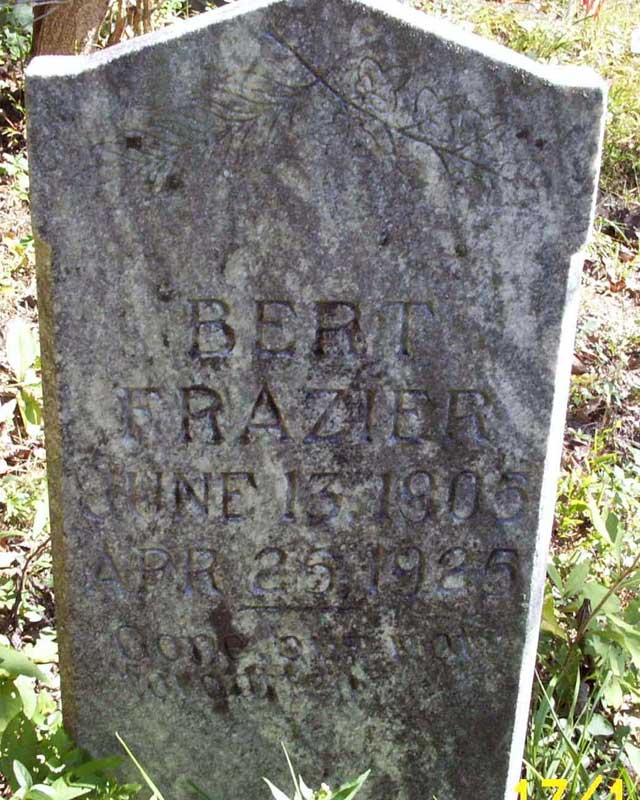 Headstone located on W. Prestonsburg Cemetery. Floyd Co. KY Bert Frazier b. June 13, 1905 d. April 25, 1925 s/o Ira Frazier and Rebecca Bolen Frazier Submitted by the neal's |