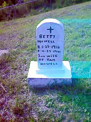 Betty Howell d/o Crit & Ella Hall Howell w/o )1 Joe Herrington )2 Tan Howell Two babies one to each side of grave, one marked, the other not. Children of Tan & Bet's, one Estill (foot stone B. H.) the other unnamed. Robert Hall (Bob Hall) Cemetery on Branham Creek off Rt. 979 Big Mud Creek., Submitted by |