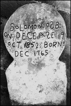 This is of the original headstone for "Indian Creek" Solomon Osborne, one of the earliest settlers in the Indian Creek area of Pike Co., KY. At the time this was taken by Jim W. Tackitt in 1987, the stone was at the home of the late Evert Fred Johnson of Etty, Pike Co., KY. This stone was taken from the W.F. Tackett Cemetery where Solomon Osborne is buried close to Wm. Tackitt Sr., 1779-1851. This original stone appeared on the W. F. Tackett Cemetery [aka The Frank Tackett Cem.] sometime before the 1991 Tackett Reunion and was standing against the tree near the Wm. Tackitt Sr. Memorial Stone. In 1995 a replacement Memorial Stone was placed in this location and the original stone was missing. The replacement stone, giving names of the children, does have some minor errors. We do not know who now has the original stone [Aug 1995]. Taken from the Tackett Assn. |