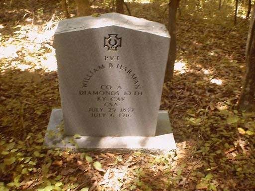 Private William B. Harman The grave is located on Dickey Town Road, near Prestonsburg. To get to the grave site, follow US 23 North to the Kentucky Route 3 exit (which also goes to Highlands Hospital), following Route 3 to the edge of the Wireman Shoals bridge, turn right on Dickie Town Road (a/k/a Bays Branch), and follow along the railroad tracks about 1 mile. The cemetery is on the right, upon a hill which can be traversed with a front wheel drive vehicle.. This cemetery is sometimes called the Robert George Cemetery, and also known as the Bays Branch Cemetery. Submitted by atlas d. hall |