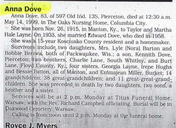 Age 86, of Martin, d, January l, 1999, at Highlands Regional Medical Center, Prestonsburg, . Born September 13, 1912, in Alphoretta,d/o Wesley Hale and Sarah Kennedy Hale. She attended the Cold Springs Regular Baptist Church , w/o Johnnie Dove. Survivors include one son, Paul Vernon Dove of Martin; two daughters, Rosa Dove Lovely of Cadiz and Ruby Dove Joseph of Martin Burial was in the Hale Cemetery on Stephens Branch, Manton.
