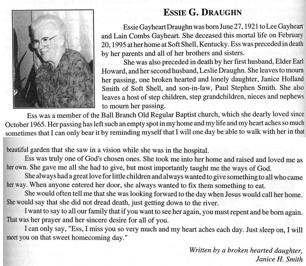 Age 88, of Morrow, Ohio, formerly of Garrett, died April 6, 1999, at the Pine Crest Nursing Home, Morrow, Ohio, She was born June 1, 1910, in Floyd County, d/o Alex Hicks and Dora Ellen Chaffins Hicks. She was a member of the Little Union United Baptist Church, Garrett. w/o William "Bill" Daniels two sons, Franklin Daniels, and John C. Daniels, five daughters, Bonnie Jean Jacobs, Maureen Hollingsworth, , Janavene Burchwell , Palestine Griffith and Beatrice Horton, Burial will be in the Guy Brown Cemetery, Stone Coal, Garrett, DANIELS, Bess Adkins 85, d-Nov.20 b-Feb. 20, 1910 d/o Jerry & Betty Parsons Adkins w/o Charles L. Daniel Sr.