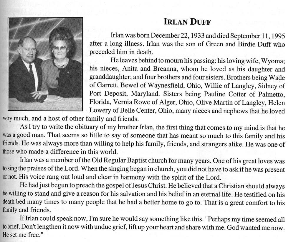 B: 12-22-133, D: 9-11-1995, s/o Green & BirdieDuff, h/o Wyoma bro-sis: Wade, Bewel, Willie, Sidney, Pauline, Vernia, Olive & Helen