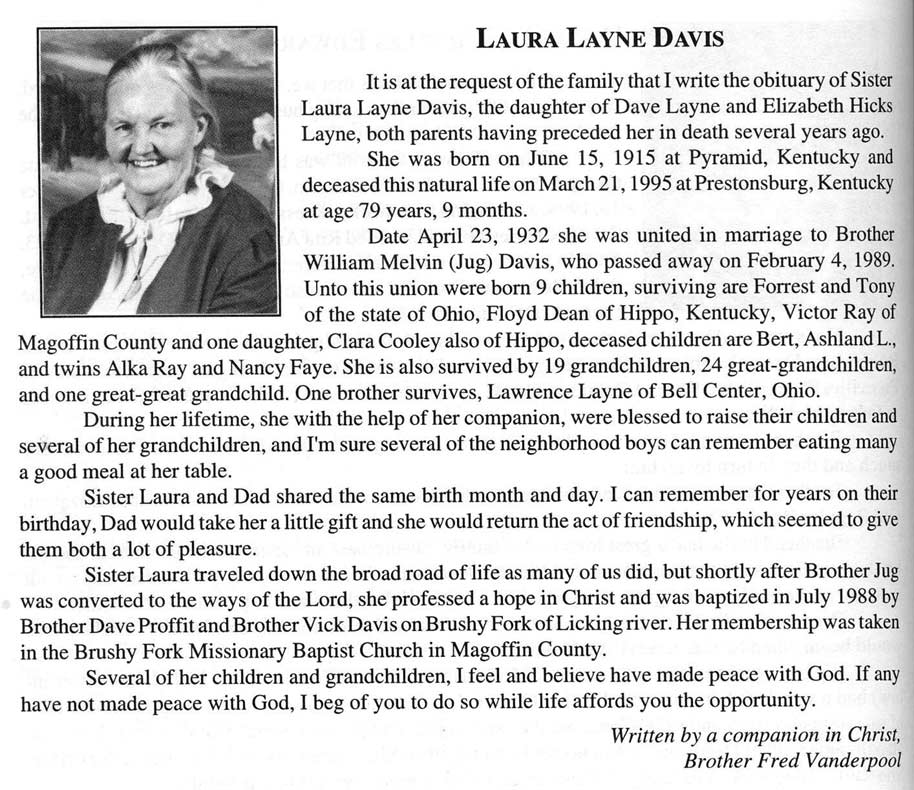 86 b-Oct.12 1911 Salisbury d-Aug.19 1998 d/o John & Fanny Halbert Salisbury, w/o-Charles Homer Davis Bur: Davidson Mem. Gardens. Ivel, Floyd Co. KY.