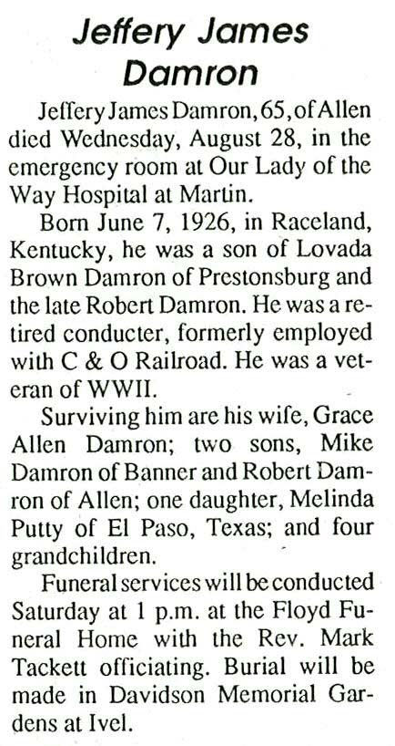 . , Age, 63, of Tram, died Friday, January 22, 1999, at Highlands Regional Medical Center following an extended illness. Bom on December 25, 1935, in Floyd County, he was the son of the late Erman and Liza Click Damron.He was a retired factory worker. Survivors include his wife, Maggie Jarvis Damron; three sons, Bobby D. Damron and Kenneth Ray Sturgill, both of Tram, John K. Sturgill of Prestonsburg; three daughters, Marsha Damron of Lexington, Vonda Sue Young of Churubusco, Indiana, Wanda Jean Johnson of Somerset; three brothers, David Damron, James Damron, and Bums Damron ,all of Prestonsburg; three sisters, Janet Sue Damron of David, Faye Jervis of Prestonsburg, Myrtle Workman of Proctorville, Ohio Burial was in the Stratton Cemetery at Ivel