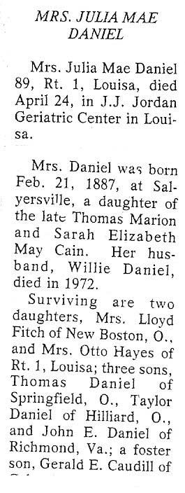 Age 82, of Trenton, Michigan, formerly of Minnie, d, July 13, 1999, at the Seaway Hospital in Trenton Michigan. She was born October 21, 1916, in Minnie, d/o Casell and Judy Howell Collins. w/o , Clifford Daniels. Survivors include one son, Ted Daniels of Alpena, Michigan; one daughter, Judy Aiken of Woodhaven, Michigan; three brothers, Preston Collins of Martin, Ed Collins of Shelby, Ohio, John Collins of Hollywood, Florida; two sisters, Vemie Messinger of Martin, --Adetta Machowicz of Pembroke Pines, Florida; nine grandchildren; bur at the Lucy Hall Cemetery at McDowell.