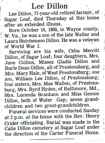 80, of Langley, d, February 27, 1998, . Born February 24, 1918 in Floyd County, s/o Felix and Lena Hoover Dudley. h/o, Jane Collins Dudley. Survivors include two sons, Lowell Dudley of Texas and Glen Dudley of Michigan; two stepsons, Roy Ratliff of Indianapolis, Indiana, and Kenny Ratliff of Ohio; one daughter, Ruby Gay Sawberger of Texas; one stepdaughter, Jean Pease of Indianapolis, Indiana; two sisters, Ethel Presley of Langley and Edith Gayheart of Allen;. . Burial was in the Hayes Cemetery on Turkey Creek, Langley