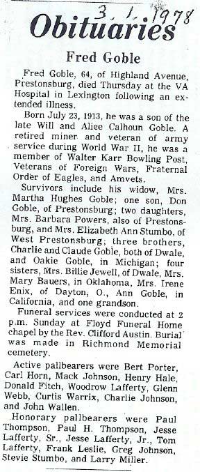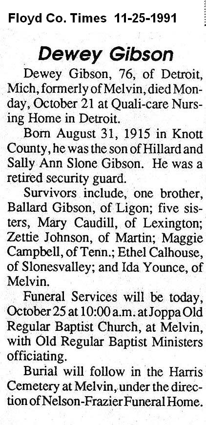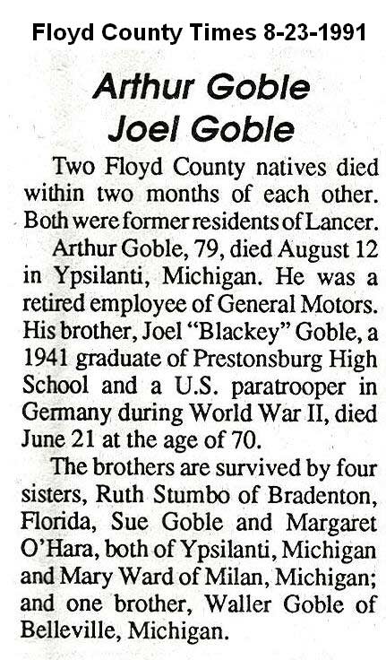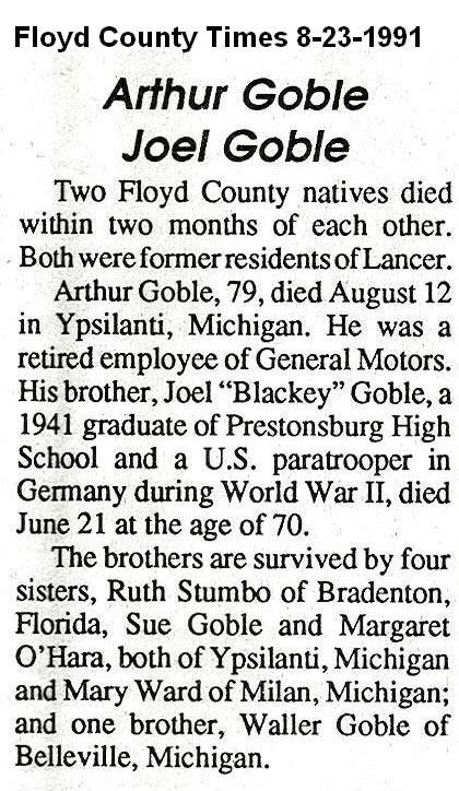 Age, 82, of Banner, died Friday, June 7, 1991 at Highlands Regional Medical Center. Born February 9, 1909 in Banner, he was the son of the late Richard and Alice Osborne Garrett. He was a retired miner who had worked for B & H Elkhorn Coal Company at Ivel and was a member of the Brandy Keg Freewill Baptist Church. Survivors include his wife, Fannie Endicott Garrett; one son, Joe Henry Garrettof Endicott; two daughters, Hettie Hunt of Prestonsburg and Rebial Lewis of Banner; one halfbrother, Amos Garrett of Betsy Layne; two half-sisters, Jessie May Froais of Roseville, Michigan and Damie Ellen Crider of Marietta, Georgia; eight grandchildren and 12 great-grandchildren. Funeral services were held Sunday, June 9, at Floyd Funeral Home with Brothers George David Garrett and Brody Amburgey, officiating. Burial was made in the Davidson Memorial Gardens at Ivel under the direction of Floyd Funeral Home. Serving as pallbearers were Dallas Justice, George David Garrett, Arco Hunt Jr., John Earl Hunt, Joey Reynolds, David Lee Garrett, Michael Goble and Dave Sipple. (FCT'S)