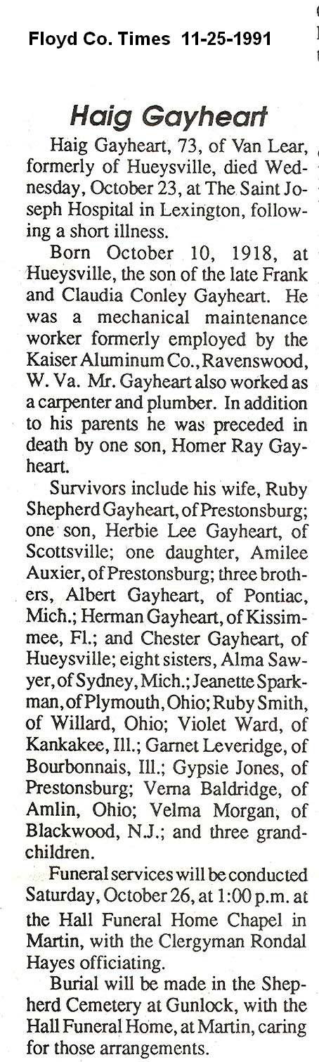 Age 85, of McDowell, died Saturday, September 6, 1997, at South Williamson ARH, . Born June 6, 1912 at McDowell, s/o Day and Betty Gayheart. . Survivors include one brother, Whitsel Gayheart of McDowell. Burial was in the Greenbury Hall Cemetery at McDowell