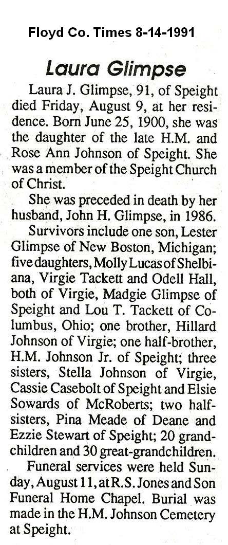 Age 81, b-Nov.03 1916-Floyd Co. d-Oct.09 1998 d/o William C. & Byrd Beavers Goble, w/o-Lawrence H. Gagle Bur: Springs Hill Cem. Fort Recovery, Ohio