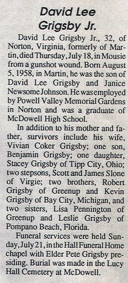 Age 40, of McDowell, died Sunday, February 27, 2000, at his residence. Born August 13, 1959,. he was the son of the late Edgar "Bob" Griffith and Bertie Marie Blair. He was an auto mechanic. He is survived by a companion, Janice Hopkins; two stepsons, Billy Ray Hopkins and Robert Keith Hopkins, both of Prestonsburg; three daughters, Kristy Griffith of Richmond, Indiana, Kelly Griffith of Crossville, Alabama; and one step-daughter, Becky Hopkins of Prestonsburg. Burial was in the Blair Family Cemetery, on Dry Branch, in Oil Springs