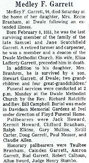 87 b-Jul.17 1911-Dwale d-Aug.27 1998 s/o Medley *& Eliza Lafferty Garrett, Bur: Davidson Mem.Gardens. Ivel.Floyd Co.Ky. [World War II Veteran]