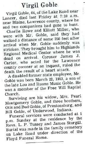 Age 55, of Roann, Indiana, died May 28, at Wabash Skilled Care Center in Wabash, Indiana. Born June 20, 1942 at Thomas, he was the son of the late Alie Griffey and Dulcie May Roop Griffey. . He was a member of the Christian Heritage Church in Wabash, Indiana. Survivors include his wife, Alberta Clark Griffey; two sons, Randell Griffey of Roann, Indiana, and Rick Griffey of Honolulu, Hawaii; seven brothers, Henry Griffey of Tampa, Florida, Paul Grifiey and George Griffey, both of Prestonsburg, Ester Griffey of North Manchester, Indiana, and Elmer Gdffey, Moses Griffey and Dean Smith, all of Wabash, Indiana; three sisters, Ruth Blankenship of Pikeville, and Marie Skeens and Martha Jane Murphy, both of Prestonsburg; and five grandchildren. Burial was in the Roann Community Cemetery in Roann, Indiana