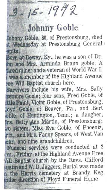 Age 85, of Pikeville, died Dec. 2nd. at Pikeville Methodist Hospital. Born in Knott Co., Aug. 4, 1913, s/o the late Crockett and Elizabeth Sexton Criffith. Survivors include two brothers, Crockett Grifith Jr. and Corbitt Raymond Griffith; three dau., Susie Stambaugh , Beulah Mae Bayless and Pauline Porter. Burial was in Davidson Memorial Gardens at Ivel.