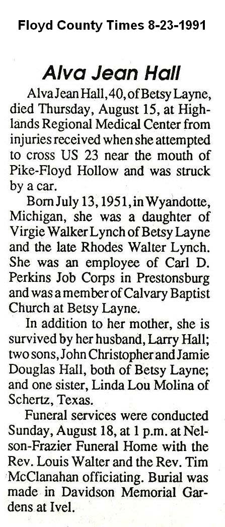 Age 59, of Lackey, Ky., passed away Tuesday, January 15, 2002, at the St. Joseph Hospital, Lexington, Ky. She was born December 3, 1943, in Drift, Ky., the daughter of the late Dock Hall and Judy Howell Hall. Survivors include one brother, Raymond Hall of Raven, Ky.; two sisters, Helen Galati of Marion, Ohio, and Hattie Staggs of Lackey, Ky. Funeral services will be conducted Saturday, January 19, 2002, at 11:00 a.m., at the Martin Branch Freewill Baptist Church, Estill, Ky., with the clergyman, Clinton "Buddy" Jones, and others, officiating. Burial will follow in the Lackey Cemetery, Lackey, Ky., under the professional care of the Hall Funeral Home, Martin, Ky. Visitation is at the church. (FCT'S)