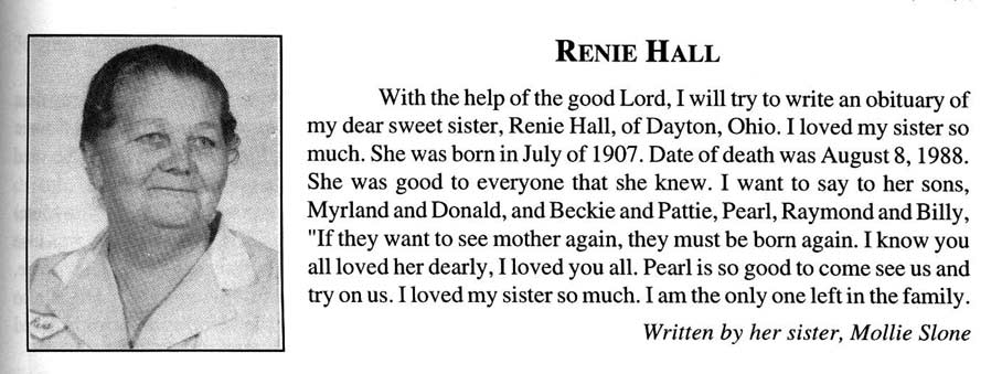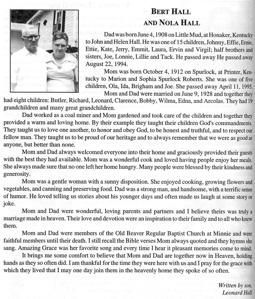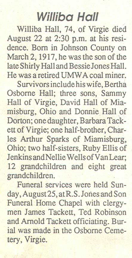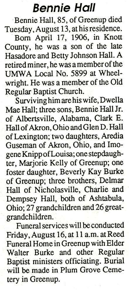 Age 78, of Robinson Creek, died Sunday, September 3, 2000, at Pikeville Methodist Hospital. He was born September 11, 1921, at Teaberry, a son of the late Talt and Nanny Hall. He was a retired coal miner and a member of the United Mine Workers of America. He was of the Old Regular Baptist faith. He is survived by his wife, Bertha Hall; five sons, Jimmy Hall of West Moreland, Tennessee, James Hall of Romulus, Michigan, Tommy Hall of Newport, and Clyde Hall and Burnis Hall, both of Robinson Creek; three daughters, Patty Compton of River Rouge, Michigan, Olive Pearl Caylor of Ecorse, Michigan, and Juanita Hall of Robinson Creek; one sister, Nellie Newsome of Beaver, and several grandchildren and great-grandchildren. He was preceded in death by two sons, Chester and Junior Hall. Funeral services are today, September 6, at 11 a.m. at the R.S. Jones and Son Funeral Home Virgie Chapel. Ministers are Dewey Roberts, Monroe Jones, Teddy Honaker, Vernon Damron and Leonard Kiser. Interment will be in the Sam Hall Cemetery at Bear Fork of Robinson Creek. (FCT's)