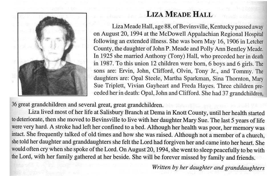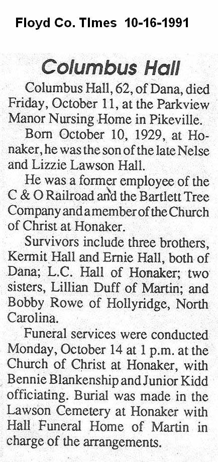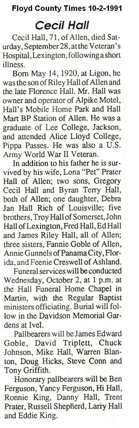 Age 82, of Prestonsburg, January 23, 1998, at H.R.M.C., Prestonsburg. Bom September 13, 1915 at Boldman, s/o Walter Hall and Lula Hatfield Hall. He was a member of the Church of Christ at Toler Creek h/o (1) Mindy Francis Newsome Hall (2) Virgie Parsons Hall; children: Cledas Hall , Charles Hall Catherine Meade , Brenda Hall ; stepchildren:, Linda Lyon , Henrietta Osborne; Stanley Niece ., Phillip D. Niece, and Russell Niece ; three brothers, John Hall , Lafe Hall, and Frank Hall of Teaberry; two sisters, Eula Lish, and Flora Bell Kirsteatter Burial was in the Meade Cemetery at Harold.