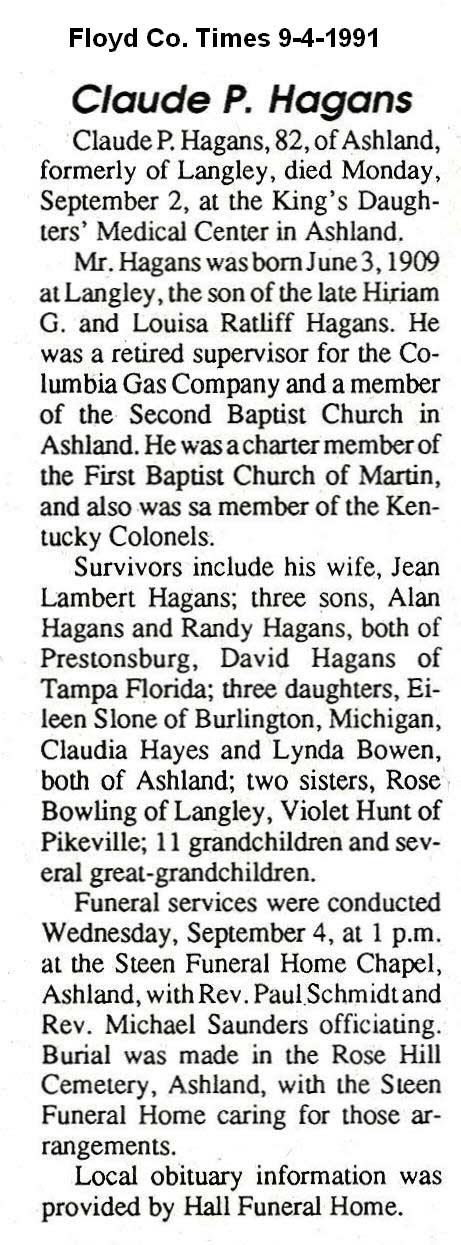 Age 85, of Ashland, died Saturday, May 9, 1998, at Wurtland Manor Nursing Home, following an extended illness. Born November 14, 1912 at Tomahawk, she was the daughter of the late Thomas and Rose Meek Lambert. She was preceded in death by her husband, Claude P. Hagans, in 1991. She was a charter member of the First Baptist Church in Martin. Survivors include one son, Alan Hagans of Martin; two daughters, Eileen Slone of Burlington, Michigan, and Claudia Hayes of Ashland; 12 grandchildren and 26 great-grandchildren Entombment was in the Rose Hill Mausoleum, under the direction of Steen Funeral Home in Ashland.