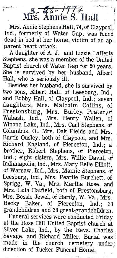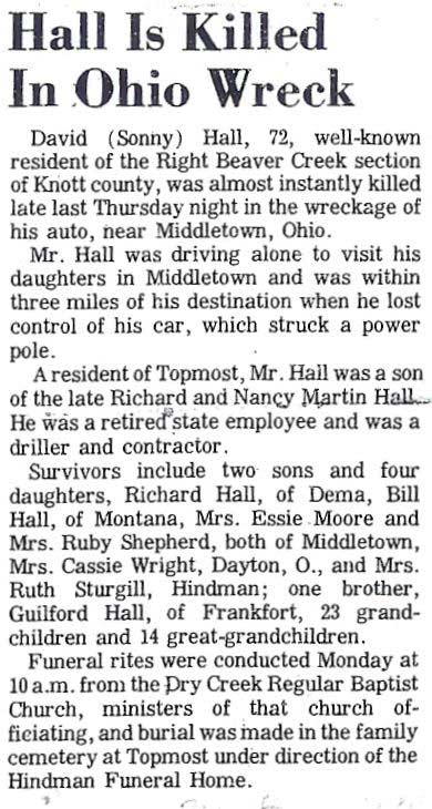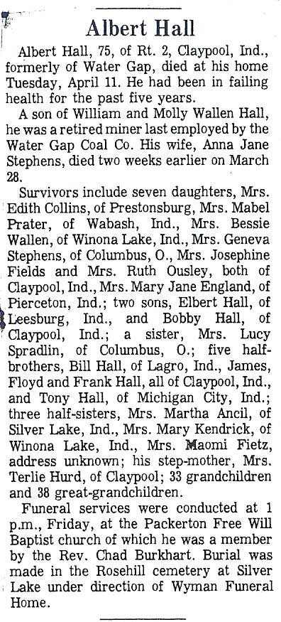 Obituary, The Floyd County Times, Prestonsburg, Kentucky, Wednesday, 26 September 1973, section 1, page 8. Sie Hall, 75 years old, of Printer, died Sunday at Our Lady of the Way hospital at Martin. A son of the late David and Rofie (should read Rosie) Howard (should read Howell) Hall, he was born at Craynor, August 6, 1898. Preceded in death by his wife, Verdie Mitchell Hall, who died in 1972, he was a retired miner from the Hamilton Coal Company and a member of the Zion Regular Baptist Church. Survivors include a son, Sie Hall, Jr., and a daughter, Frances Hall, both of Craynor and one sister, Mrs. Viola Mitchell, of Teaberry. Fifteen grandchildren and 23 great-grandchildren also survive. Funeral services were conducted Wednesday at 10 a.m. at the home with ministers of the Regular Baptist Church officiating. Burial was made in the Ike Roberts cemetery at Grethel under the direction of the Hall Brothers Funeral Home.