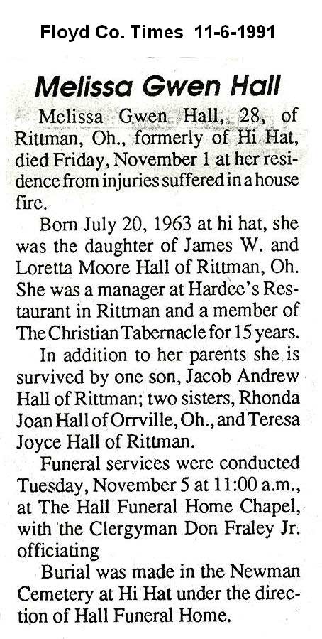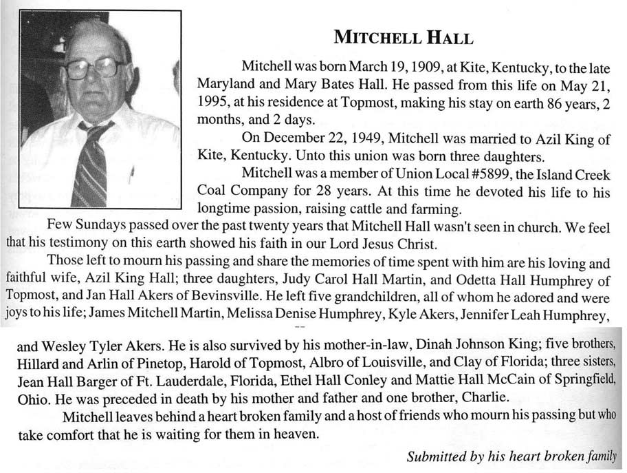 , Age 69, of Hi Hat, d. February 10, 1998,HRMC, Prestonsburg, Born March 28, 1928 in Floyd County, s/o Talt and Nannie Blankenship Hall. He was a member of the Samaria Old Regular Baptist Church at Teaberry. h/o Virginia Dryl Mitchell Hall, Burial was in the Reynolds Cemetery at Hi Hat