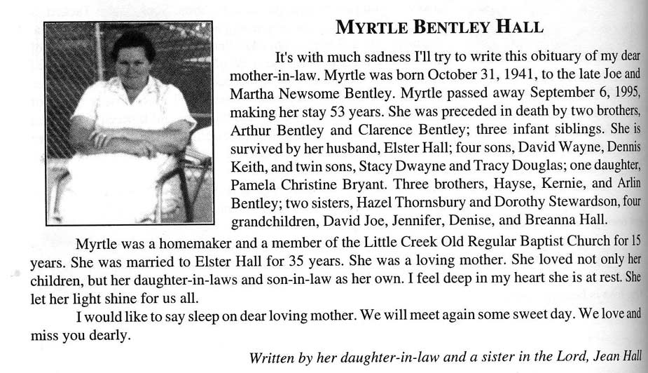 Age 81, of Springfield, Ohio, formerly of Wheelwright, died Wednesday, November 5, 1997, at Pillars Healthcare, Born January 8, 1916 in Wheelwright, d/o Odie and Nancy Hall Little. w/o (1) Marion Hall, (2) Berlin Hall. Survivors include one son, Clark Hall of Xenia, Ohio; one stepson, Ray Hall of West Virginia; five daughters, Marie Little of Wheelwright, Manda Hall and Brenda Hall, both of Cedarville, Ohio, Marcella Wallen of Portsmouth, Ohio, and Mary Hawes of Springfield, Ohio; two stepdaughters, Mildred of California and Ruth Wright ; two sisters, Ella Bentley and Lissie Sowards . Burial will be in the Little Cemetery at Bypro