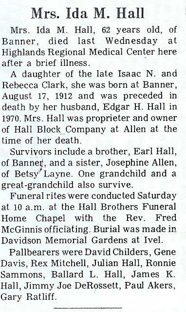 Age 71, of Melvin, died Sunday, January 28, 2001, at Highlands Regional Medical Center, Prestonsburg, following an extended illness. Born on February 7, 1929, in Topmost, she was the daughter of the late Jonts Isaac and Victoria Cook Isaac. She was a member of the Martin Branch Freewill Baptist Church. She was preceded in death by her first husband, Howard Hicks. She is survived by her husband, Estill Hall. Other survivors include one son, Charles Hicks of Garrett; one daughter, Cathy Epling of Garrett; one brother, Berlin Isaac of Topmost; four sisters, Hesta Bates of Melvin, Flora Hall of Topmost, Gertrude Jones and Lillie Coleman, both of Columbus, Ohio; and four grandchildren. Funeral services will be conducted Wednesday, January 31, at 11 a.m., at the Nelson-Frazier Funeral Home, at Martin, with ministers of the Old Regular Baptist Church officiating. Burial will be in the Hicks Cemetery, at Garrett. (FCT'S) HALL, Sam, b. July 22, 1864, d. Feb 15, 1945, married Lynn Johnson. Had 11 children: Talt, d. bef 1945, Dick, d. bef 1945, Carline, Angeline, Bill, Martin, Vady, Alice, Mattie, Mary Ellen and Calvin