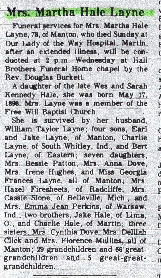 Age 34, of Manton, died Sunday at a Lima, Ohio hospital, the victim of a heart attack. Mrs. Lumpkins had gone to Lima to attend the wedding of her son, Glenn. Born in Kentucky, March 24, 1934, she was a daughter of Glenn and Mary Ellen Stephens Cooper of Manton. Additional survivors are three other sons and three daughters; Danny, Harold, Joseph, Pauline, Linda, and Kathy Lumpkins, all at home, and two brothers, Rayburn Cooper, of Lima, and Ira Cooper, of Delphos, Ohio. Funeral rites were held Wednesday at 10 a.m. from the home of the victims's parents. Ministers of the Church of Christ officiating. Burial was made in the family cemetery at Manton, the Hall Brothers Funeral Home directing. Submitted by Linda Gunnels