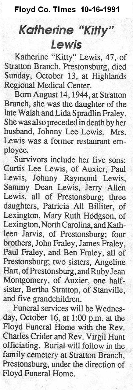 Age 71, of Ligon, d, May 5, 1999, at Hazard Appalachian Regional Hospital, . Born on February 1, 1928, in Beaver, d/o Duran and Nancy Bentley Hamilton. She was a member of the Wheelwright Freewill Baptist Church. w/o, Arthur T. Lucas. Survivors include three sons; Phillip Lucas of Oil Springs, Dewey R. Lucas of Lincoln Park, Michigan, Jerry Lucas of Ligon; one step-son, Bill Fraley of Lexington; one daughter, Janice Parker of Columbus, Ohio; one brother, Delmar Hamilton of Gahanna, Ohio; one sister, Irene Spradlin of Columbus, Ohio; Burial will be in the Burton Cemetery at Ligon.
