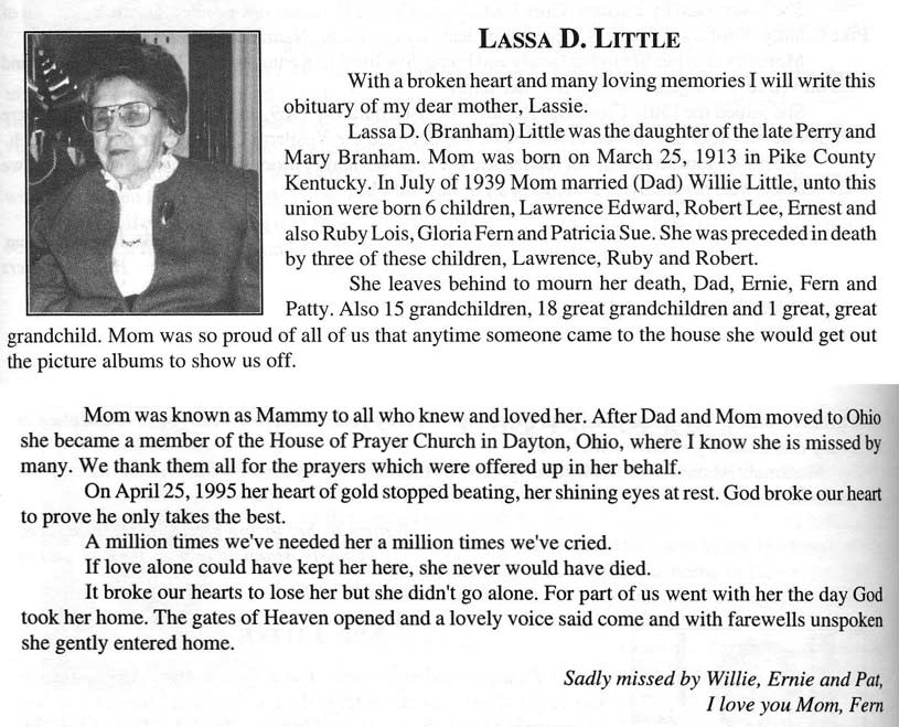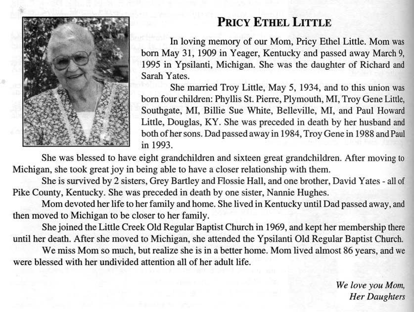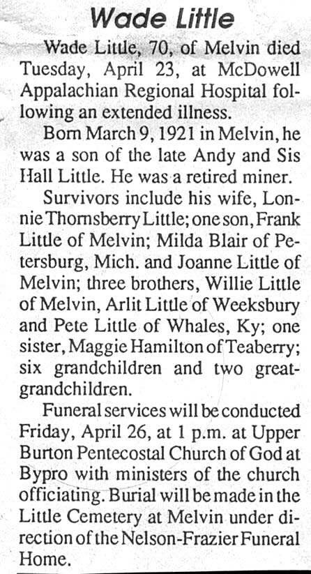 Age 57, of Lebanon, Ohio, formerly of Dema, died last Thursday, August 13, at the Kettering Medical Center in Dayton, O., following a brief illness. He was born November 16, 1929 at Dema, a son of the late Dennis and Dona Tackett Little. An electrician for Wagner Smith Company in Dayton, he was a member of the International Brotherhood of Electrical Workers, Local Union No. 82. He is survived by his wife, Evelene Webb Little, one son, Thomas G. Little, of Lowell, Mass.; one daughter, Shelia Little Pummill, of Lebanon, O.; one brother, Malcom Little, of Price; five sisters, Jeanette Mullins and Adith Morris, both of Hippo, Mamie Sturgill, of Wayland, Gracie Johnson, of Hi Hat, Lora Layne, of Dema, and three grandchildren. Funeral services were conducted Monday at 11 a.m. at the Pilgrim Rest Regular Baptist Church at Price with Ray Shelton, and other Regular Baptist ministers officiating. Burial was made in the Little family cemetery at Price, under direction of the Hall Funeral Home. (FCT'S Prestonsburg, Kentucky, Wednesday, 19 August 1987, section 1, page 12.) LITTLE, Thomas Jefferson, " T. J. ", Age 67, of Melvin, Died Thursday, September 9, 1999, at Pikeville Methodist Hospital. Born on April 17, 1932, in Floyd Co., he was the son of the late Willard Little and Liza Little Cook. Burial will be in the Little/Sie Hall/Wheelwright City Cemetery at Wheelwright. Children: Vicki Little Adkins, Kenny Little, Pamela Denise Little Ranier, and Robin Dean Little.