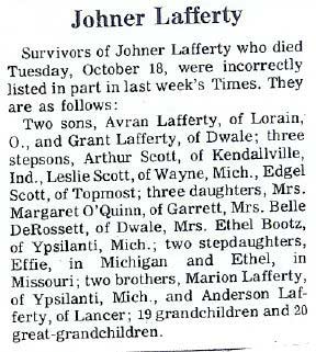 60, of Garrett died May 31, 1986 in Garrett. He was born in Greenwich, Ohio December 26, 1925 to Ezra and Mary Thacker Laferty and married Erma Jean Martin Laferty. Burial in the Turner Cemetery at Eastern.