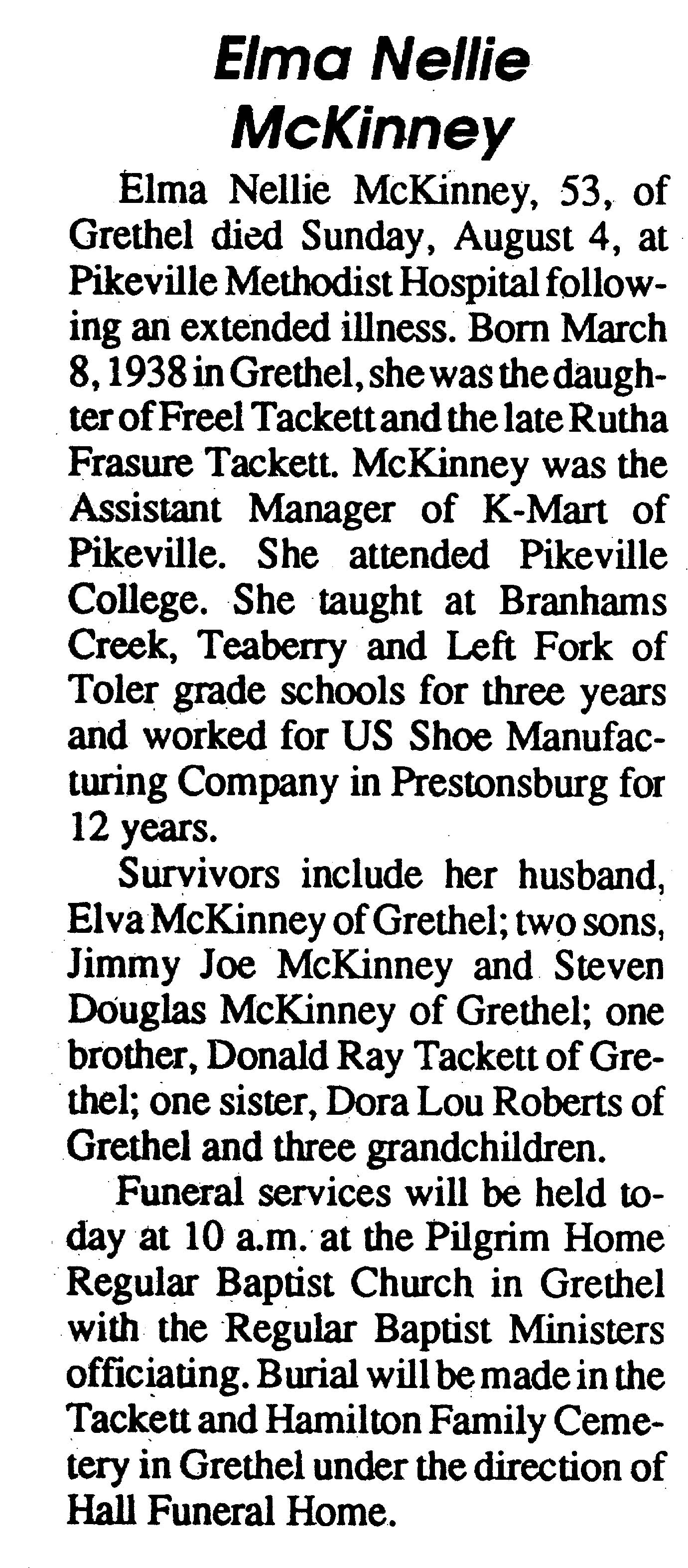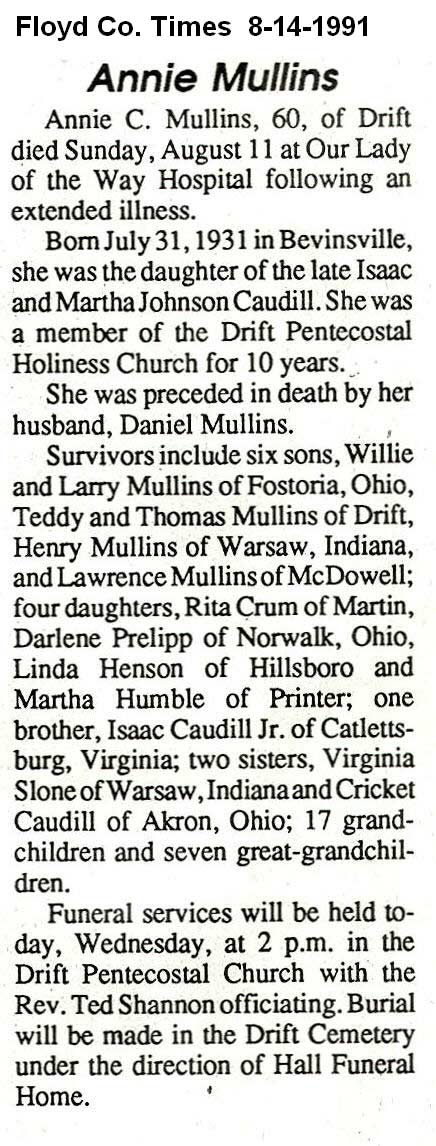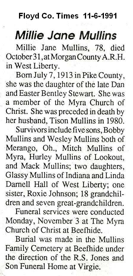 , Age 84, of Pikeville, died Sunday, June 21, 1998. Born January 17, 1914 in Pike County, she was the daughter of the late Virgie Hy[ton Smallwood and Adam Smallwood. She was a memeber of the Meta Baptist Church. She was preceded in death by her husband, Fonso Mullins. Survivors include four sons, Gary Blaine Mullins and Dale Craig Mullins, both of Pikeville, Lowell Reid Mullias of Lexington and Stoney Eric Mullins of Kimper; three daughters, Sherry Gwynn Bundy of Pikeville, Grathley Gall Reed of Chicago, Illinois, and Regis Lynne Mattingly of Ashland; four sisters, Mae Fleming, Sydney Dalton and Sue Scott, all of Pikeville, and Janice Hall of Betsy Layne, Burial was in the Mullins Family Cemetery at Dorton