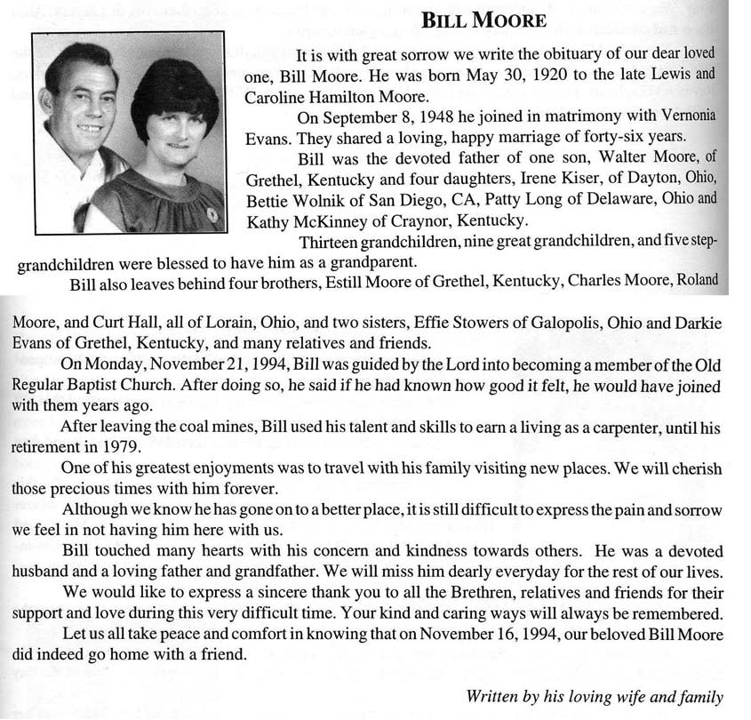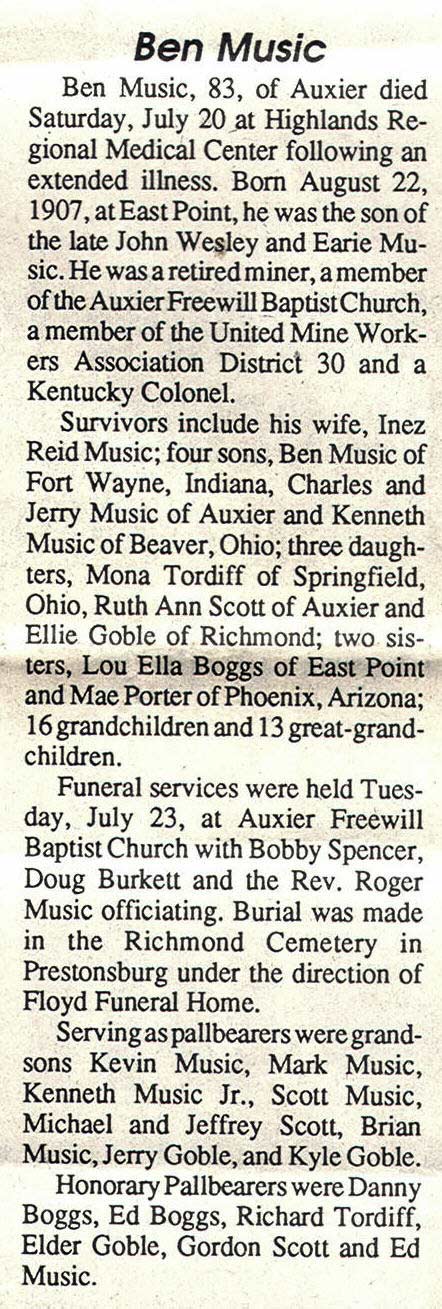 1909-1993 Retired miner, Okra Music, 84, died Sunday, December 12 1993 at Highland Regional Medical Center, in Floyd Co Ky. Mr. Music was born October 29 1909, in Floyd County, the son of the late William Jefferson and Laura Honeycutt Music He was a member of the Whitaker Freewill Baptist Church. He was preceded in death by his wife, Hazel Spencer Music, in June 1992. Surviving are one son, Donald Ray music of Nippa; two brothers, Ted Music of New Port, Virginia; and Abe Music of Dawson Springs; two sisters, Carrie Wells of Auxier; and Edna Sherman of Georgia; and 14 grandchildren and nine great grandchildren. Funeral services were held Wednesday, December 15 at Preston Funeral Home Chapel, with Bennt Taylor officiating. Burial was in Music Family Cemetery at East Point. Submitted by Darrell Music music298@verizon.net