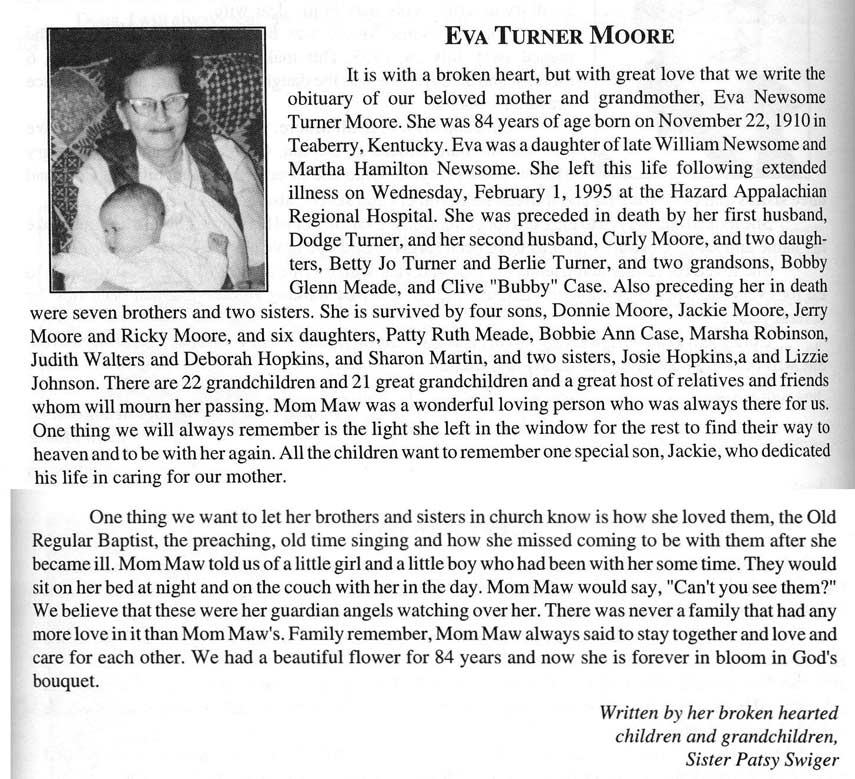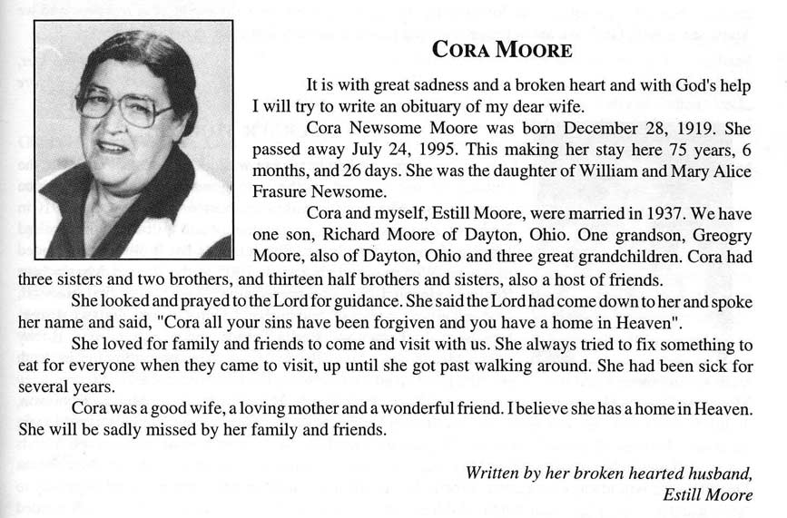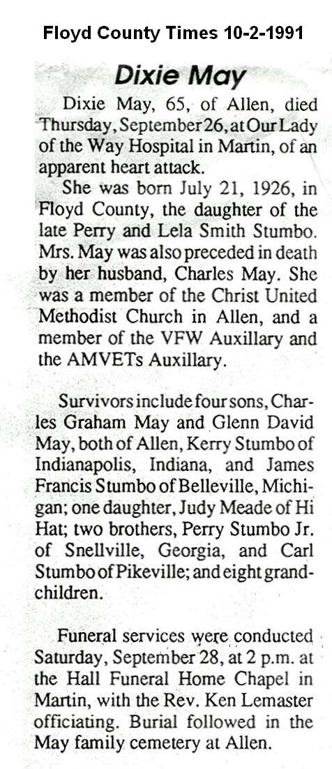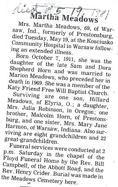 1922-1996 Olive Grace MUSIC, 74, of East Point Ky died June 20, 1996 at her home of an extended illness. Born January 10, 1922 in FLOYD CO, KY. She was the daughter of the late Samuel K. Music and Nora Bell Virginia Davis Music. She is survived by her daughters, Betty Baldridge Schuster of Abbott Creek, and Joyce Ann Compton Post of Portsmouth, Ohio, one brother, Edward C Music, of Prestonsburg ; two sisters, Malta Music Rice of East Point , Goldie Music Collins of Prestonsburg, grandchildren and ggrandchildren. Burial in the Music Family Cemetery at East Point condensed from The Floyd Co Times June 21, 1996 NOTE: At one time Olive & family lived in the old Samuel K. Music farm near East Point, Ky Submitted by Darrell Music music298@verizon.net