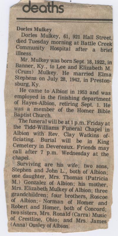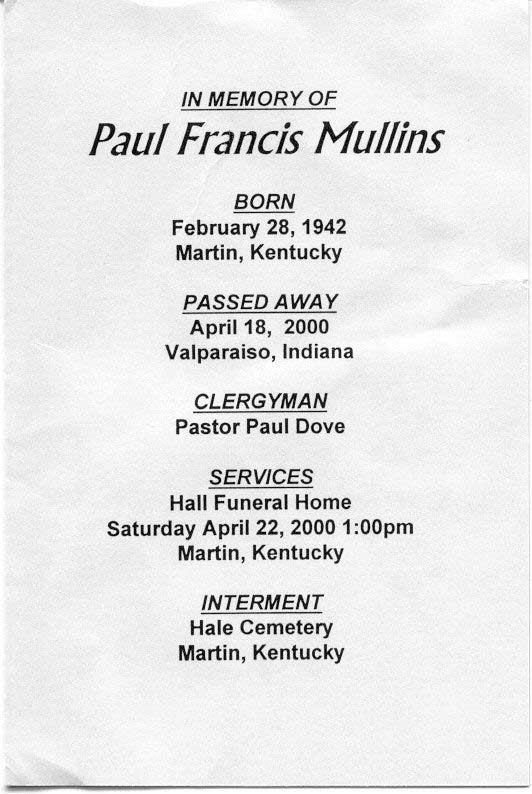 , Age 68, of Albion, MI formerly of Stephens Branch, Martin, died Jan. 24, 1999. Born Dec. 9, 1930, at Stephens Branch, s/o the late Hampton F. and Florence Hale Mullins. Survivors include one son, Eddie Mullins; three daugs. Michelle Mullins, Ann Marie Mullins and Janelle Denise Mullins; five brothers, Paul , Hampton Jr., Larry James, Denver and Claude; three sisters, Bessie Woods, Avaleen Lee, and Rose Lee Newsome. Burial was in the Hale Cemetery on Stephens Branch.
