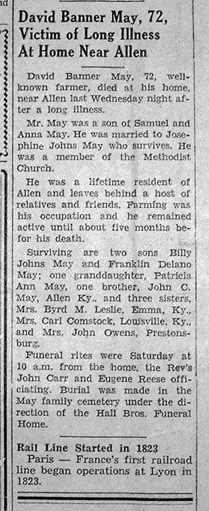 1954 AUXIER RESIDENT DIES SUDDENLY WHILE AT WORK Services to be Friday for Claude Music, 28 Claude Odell Music 28, lifelong resident of Auxier, Ky. died suddenly Tuesday morning (Mar.30 1954) while working at the Princess Elkhorn Coal Company at David. The cause of death was undetermined. An autopsy was performed Tuesday. The son of Claude and Agnes Stewart Music, he was born March 14, 1926 in Floyd County. He was married February 28, 1949 to Janice Wells who survives. Surviving besides the wife and parents are one son, Doyle Music, at home, and three brothers, Ralph, Forrest and Jerome Music all of Auxier. Funeral services will be held at 2:00 p.m. Friday at the Auxier Methodist Church with Rev. S. C. Honeycutt officiating. Burial will be made in the family cemetery at Auxier under the direction of the Jones and Preston Funeral Home. PAINTSVILLE HERALD WEDNESDAY MAR.31 1954 NOTE: Deathdate figured and entered into this obituray from publication date. Submitted by Darrell Music music298@verizon.net