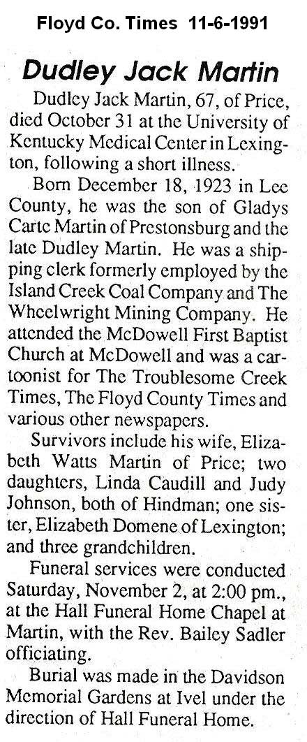 b-May 09 1917 Melvin, Ky d-Jul.04 1998 d/o-Billy & Darcus Little Johnson w/o-Muriel Martin Bur: Buckingham Cem. Floyd County, Ky.