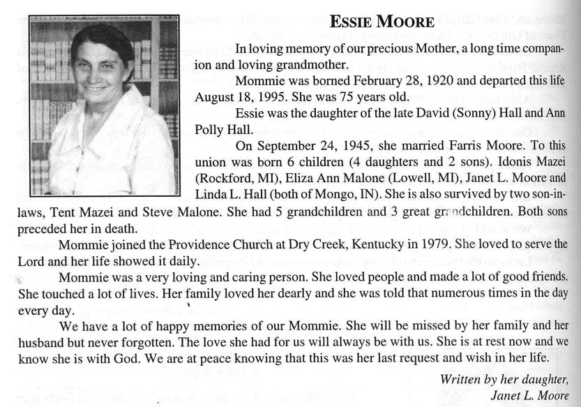 June 50, d-Apr. 5, 1996, b-Jan. 8, 1946, d/o Eliza and Hassie Ward Hall. w/o Lester Murphy