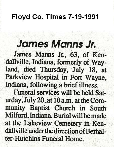 Age, 81, of Rensselaer, passed away April 16, 2006. He was born May 6, 1924 in Salyersville, Ky the son of Bernie Manns and Cecilia Howard Manns. He was educated at the Kentucky Public Schools and was in the US Army during WWII, from 1945 thru 1947. HE was a resident of Rensselaer since 1939. He had been a farmer, construction laborer, barber and a motel operator. On May 31, 2003, he married Mildred Mae (Davis - Wathers) she survives. He was affiliated with the Baptist Church. Surviving are a son, Randall Arbie (Christine) Manns of Taholoma, TN; an daughter Sandra Joyce Manns of Kouts; 5 grandchildren, 6 great-grandchilden and i great-great-grandson. Surviving brothers and sisters are: Bill (Thelma) Manns or Rensselaer; James (Ora) Manns or Mississippi, Everett Carl (Retta) Manns of Rensselaer; Ernie "Dick" (Leta) Manns of San Pierre; Maudline (Ray) Campbell of San Pierre; and Maxine (Forrest) Miller of Rensselaer. He was preceded in death by his parents. Visitation is at the Steinke Funeral Home 4 pm till 8 pm Thursday April 20th with funeral services April 21st at 10am with Pastor Larry Piatt officiating. Interment at Graceland Cemetery, Valparaiso, Indiana