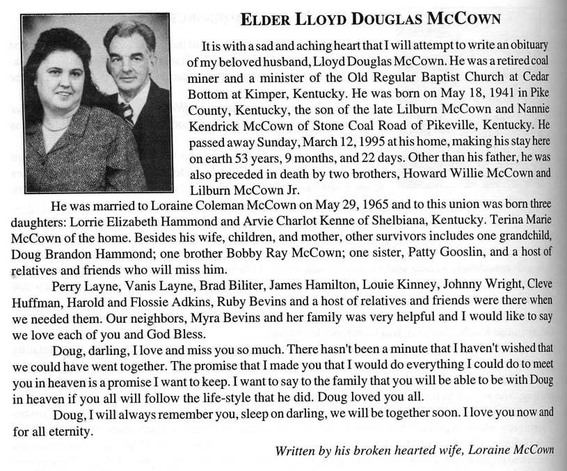1914-1995 Age, 80, died Thursday, April 27 1995 at Highlands Regional Medical Center, FLoyd Co Ky. Mr. Music was born August 12, 1914, in Floyd County, the son of the late W.L. Music and Hattie C. Stone Music. He was a retired chief field agent from Kentucky West Virginia Gas Company, member of Little Paint First Church of God and National Management Association and a World War Il Army veteran. Also preceding him in death were two brothers and one sister. Serving are his wife, Eunice Burke Music; two sons; Ronnie Music of Auxier and Mearl Music East Point; two brothers, Dewey and Bobby Joe Music both of East Point; five sisters, Alta Mere Howard and Hazel Baldridge, both of East Point, Nell Ross of Michigan, Mary Badgett of Finley, Ohio and Gertrude Auxier of Hager Hill; and four grandchildren. Funeral services were held Saturday, April 29 at Jones-Preston Funeral Home Chapel, with Wayne Burch officiating Burial was in Music Family Cemetery at East Point. Submitted by Darrell Music music298@verizon.net