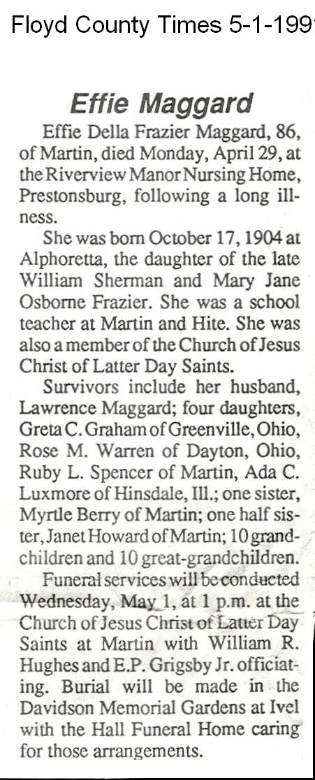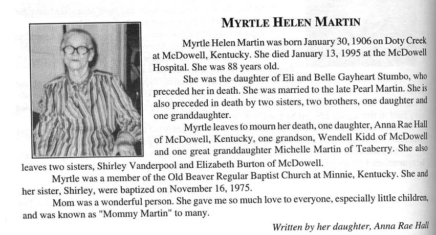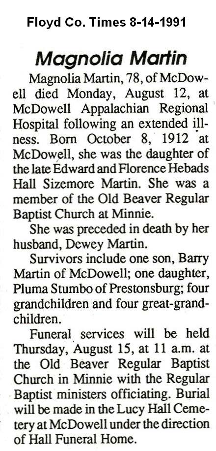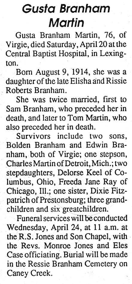 Age, 97, of Westland, Michigan, formerly of Harold, died Monday, March 19, 2001, at her residence. She was born March 23, 1903, in Grethel, the daughter of the late George and Arminia Frasure. She was a member of the Grethel Missionary Church. Her husband, Evan Martin, preceded her in death. She is survived by one son, Elmer Martin of Grethel; two daughters, Helene Joseph of Toledo, Ohio, and Lucy Stephenson of Westland, Michigan; one sister, Nora Tackett of Dayton, Ohio; 17 grandchildren, several great-grandchildren, and great-great-grandchildren, and one great-great-great-grandchild. Funeral services will be conducted Friday, March 23, at the Hall Funeral Home Chapel, Martin, with pastors of the church officiating. Burial will be in the Arminia Frasure Martin Cemetery, at Harold. (FCT'S)