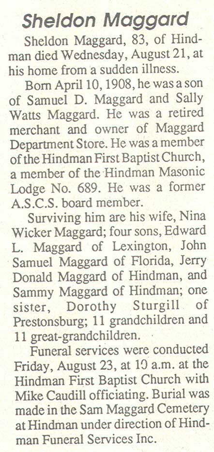 Age 64, Prestonsburg, Ky., wife of Harry Mace Jr., passed away Thursday, March 14, 2002, at the Highlands Regional Medical Center, Prestonsburg, Ky. She was born October 11, 1937, in Martin, Ky., the daughter of the late Riley Shepherd and Mary Haywood Shepherd. Mrs. Mace was a homemaker and a member of the Third Avenue Freewill Baptist Church. In addition to her husband, she is survived by two sons, Thomas Compton of Martin, Ky., and Harry Keith Mace of Prestonsburg, Ky.; one daughter, Carol Collins of Prestonsburg, Ky.; one brother, Kenneth Ray Shepherd of Martin, Ky.; two grandchildren, Donald Matthew Collins and Kiara Marie Compton. Funeral services for Shelby Jean Mace will be conducted Sunday, March 17, 2002, at 1 p.m., at the Hall Funeral Home Chapel, Martin, Ky., with the clergymen, Manford Fannin and Youl Altizer, officiating. Burial will follow in the Davidson Memorial Gardens, Ivel, Ky., under the professional care of the Hall Funeral Home. Visitation is at the funeral home. (FCT'S)